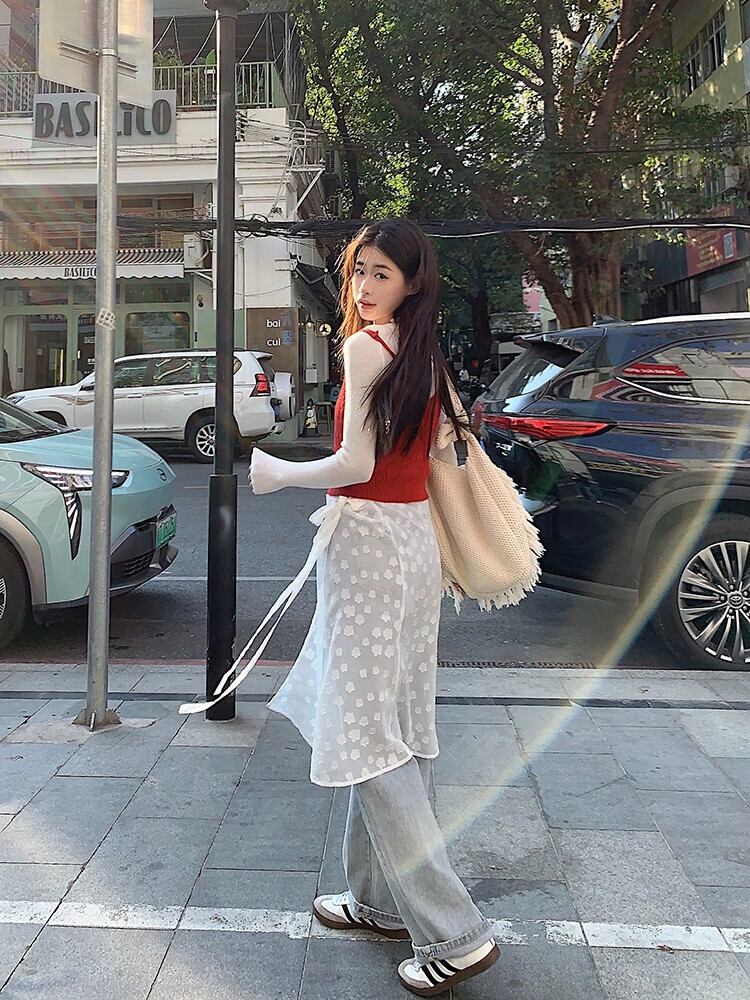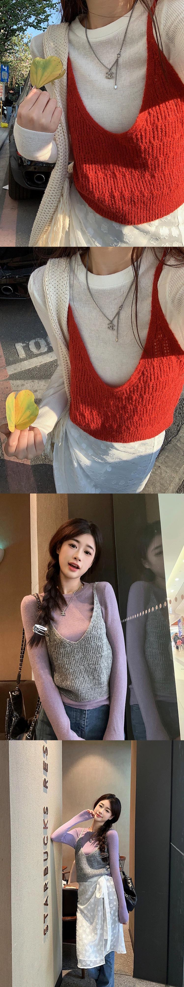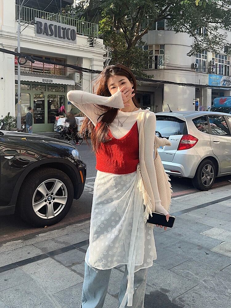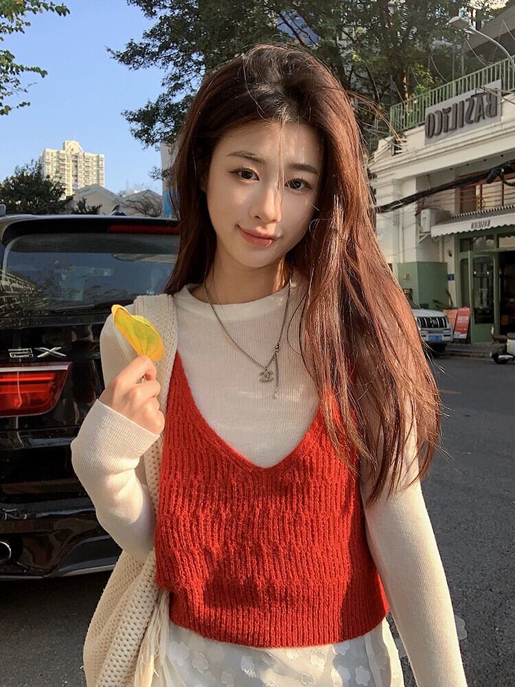 レッドニットキャミソールレディース2024春新作スタイルレイヤードインナーレイヤードシャツベストトップアウター スプリング 春物 857168549853715