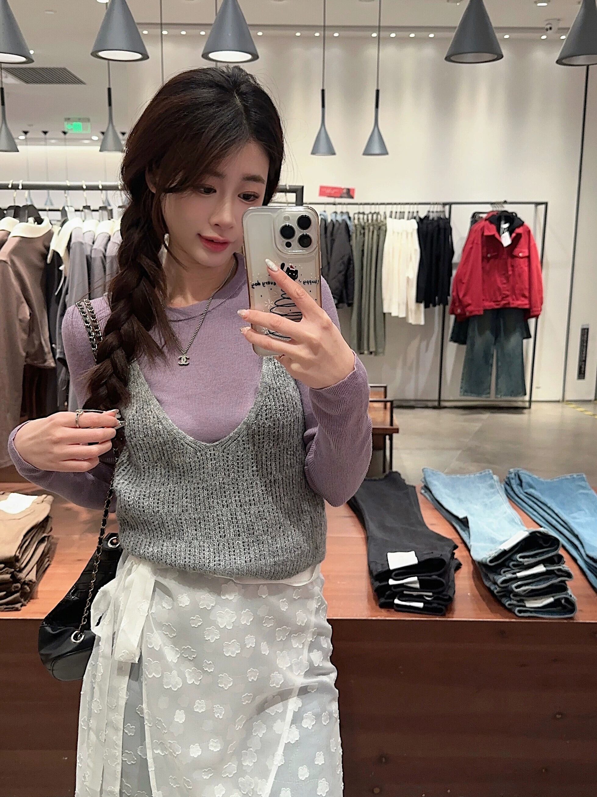 色:白いTシャツ,パープルTシャツ,グレースリング,赤いサスペンダー,お尻カーテンスカート