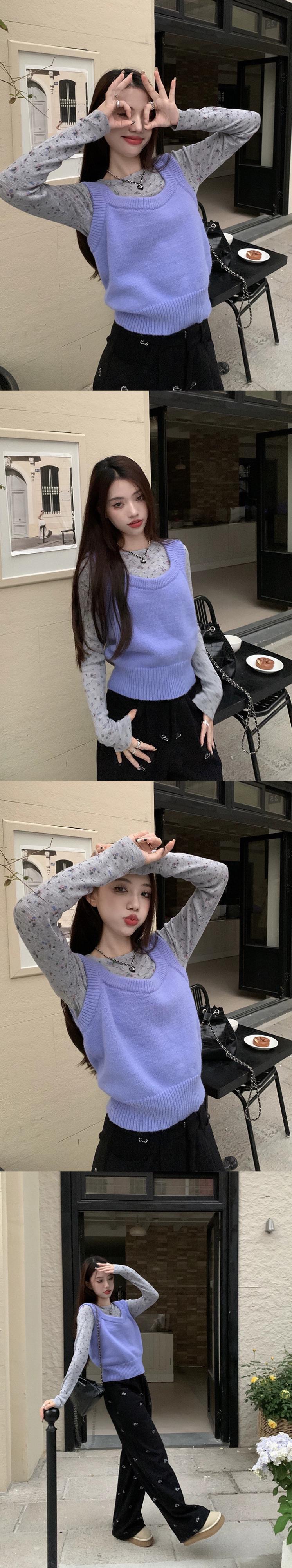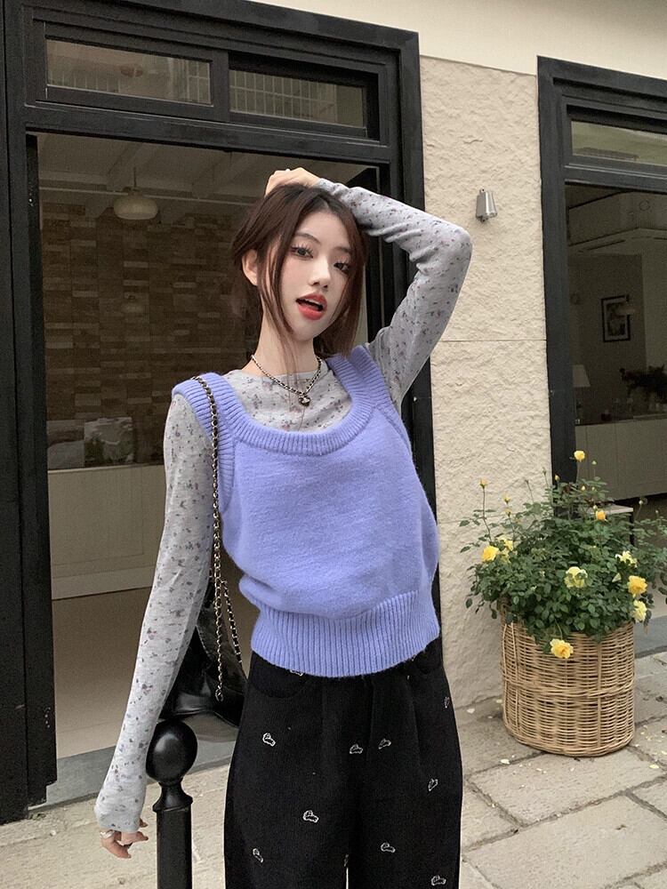 色:グレーの花柄トップス,アプリコットフローラルトップ,ピンクのベスト,ブルーベストベスト