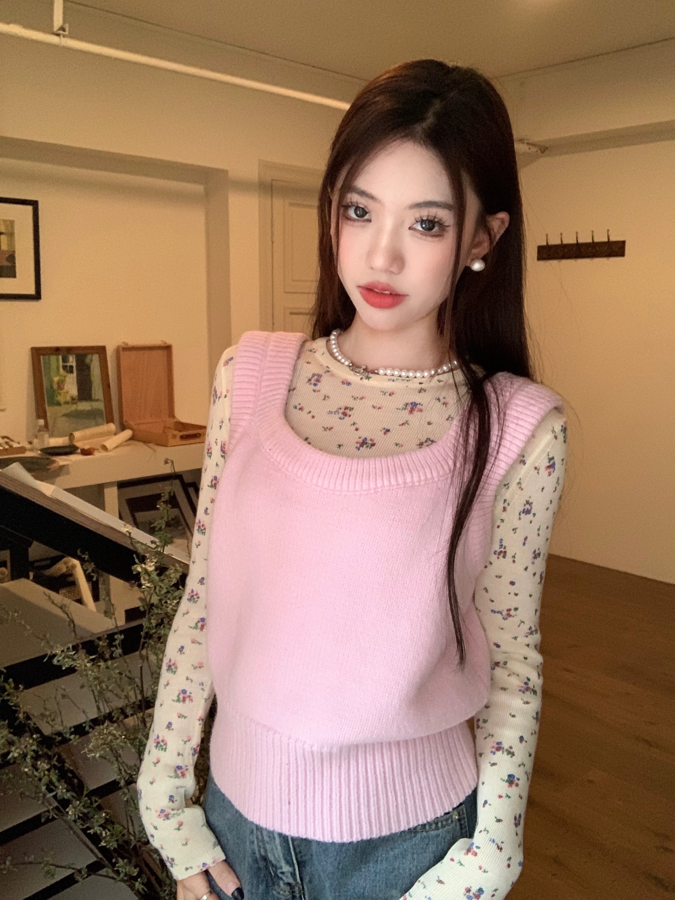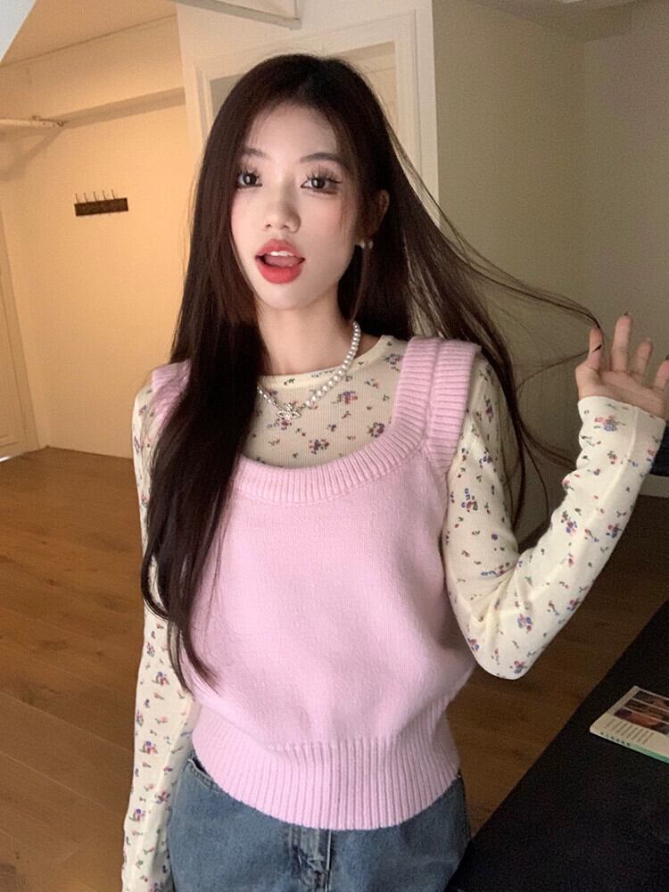 甘いピンクのニットセーターベスト女性春緩くて痩身レイヤードベストとベストトップ レッド 大人ガーリー スウィート キュート カジュアル スプリング 春物 8571650190828867